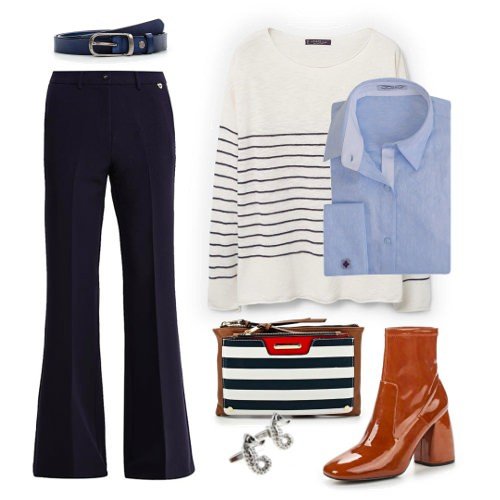 современная интерпретация тельняшки. Носите с брюками-клеш и голубой женской рубашкой, а