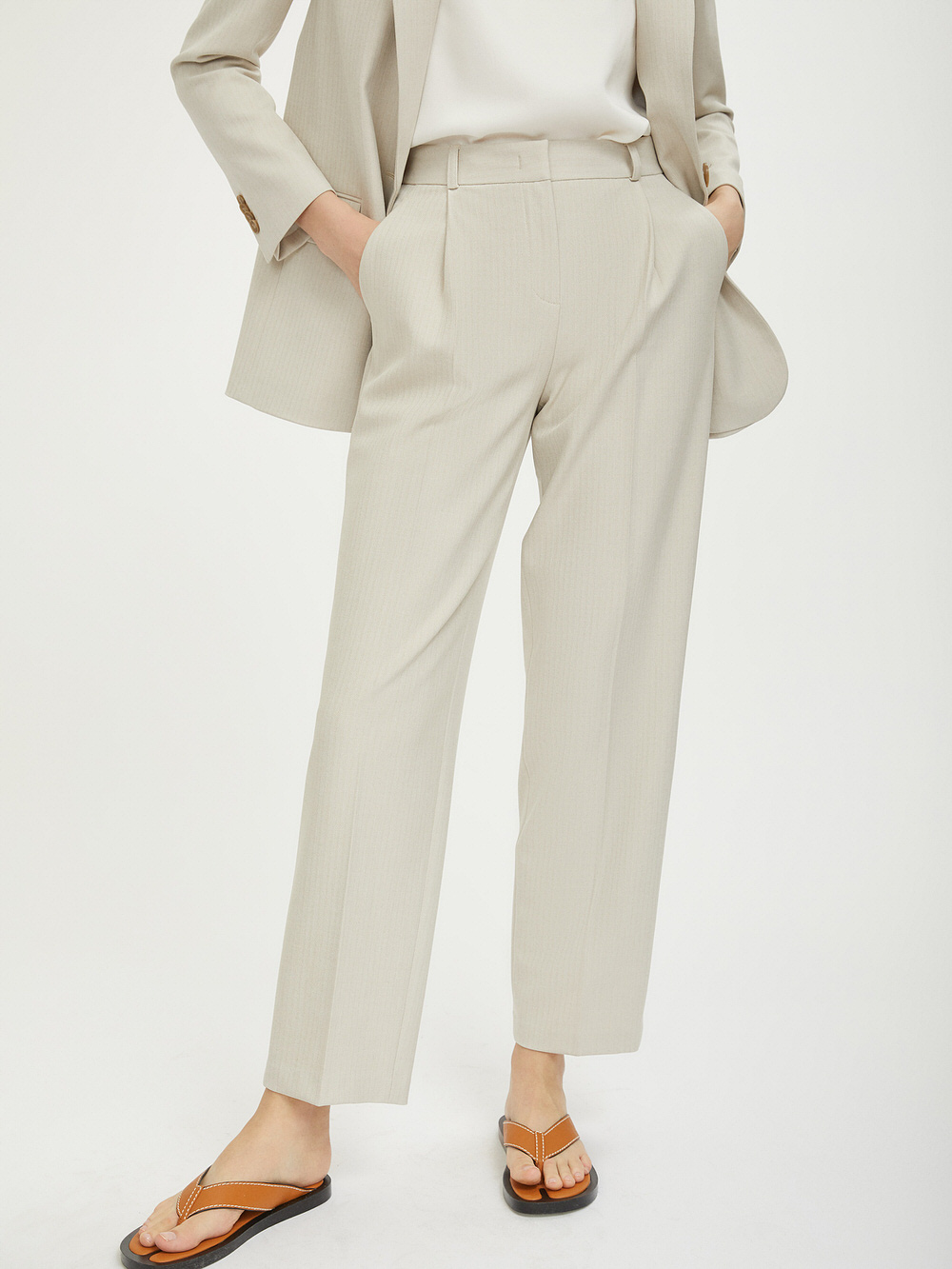 Брюки прямого кроя с узором “елочка”. Высокая посадка, шлевки для ремня, боковые карманы, декоративный карман сзади.