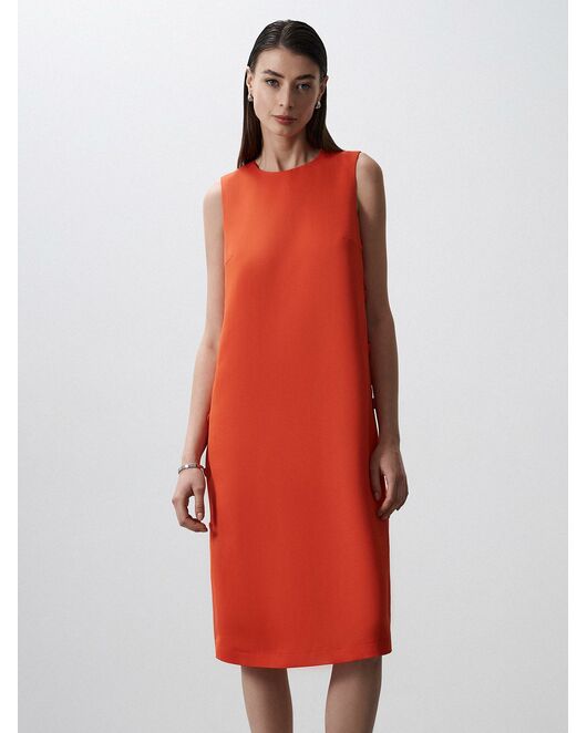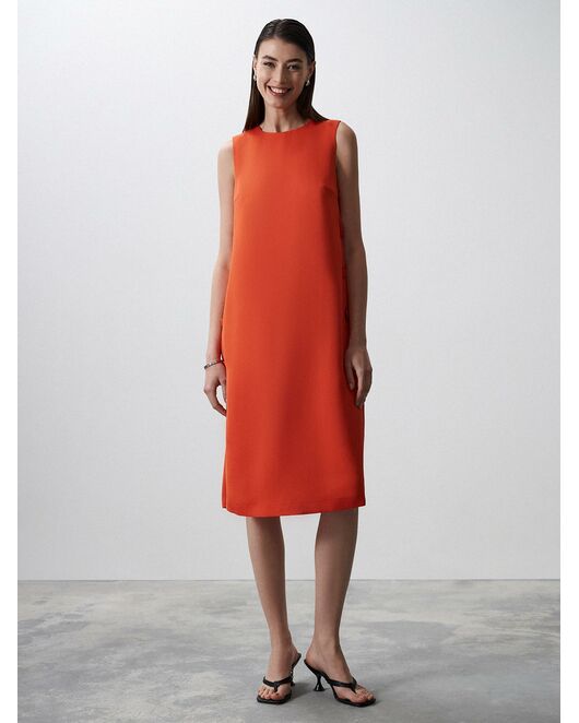 Платье миди без рукавов станет центром притяжения внимания благодаря насыщенной расцветке. Легкая струящаяся ткань с содержанием льна продублирована подкладкой из натурального хлопка для максимального комфорта. Лаконичное платье декорировано разрезами по бокам с крупными пуговицами, обшитыми основной тканью.