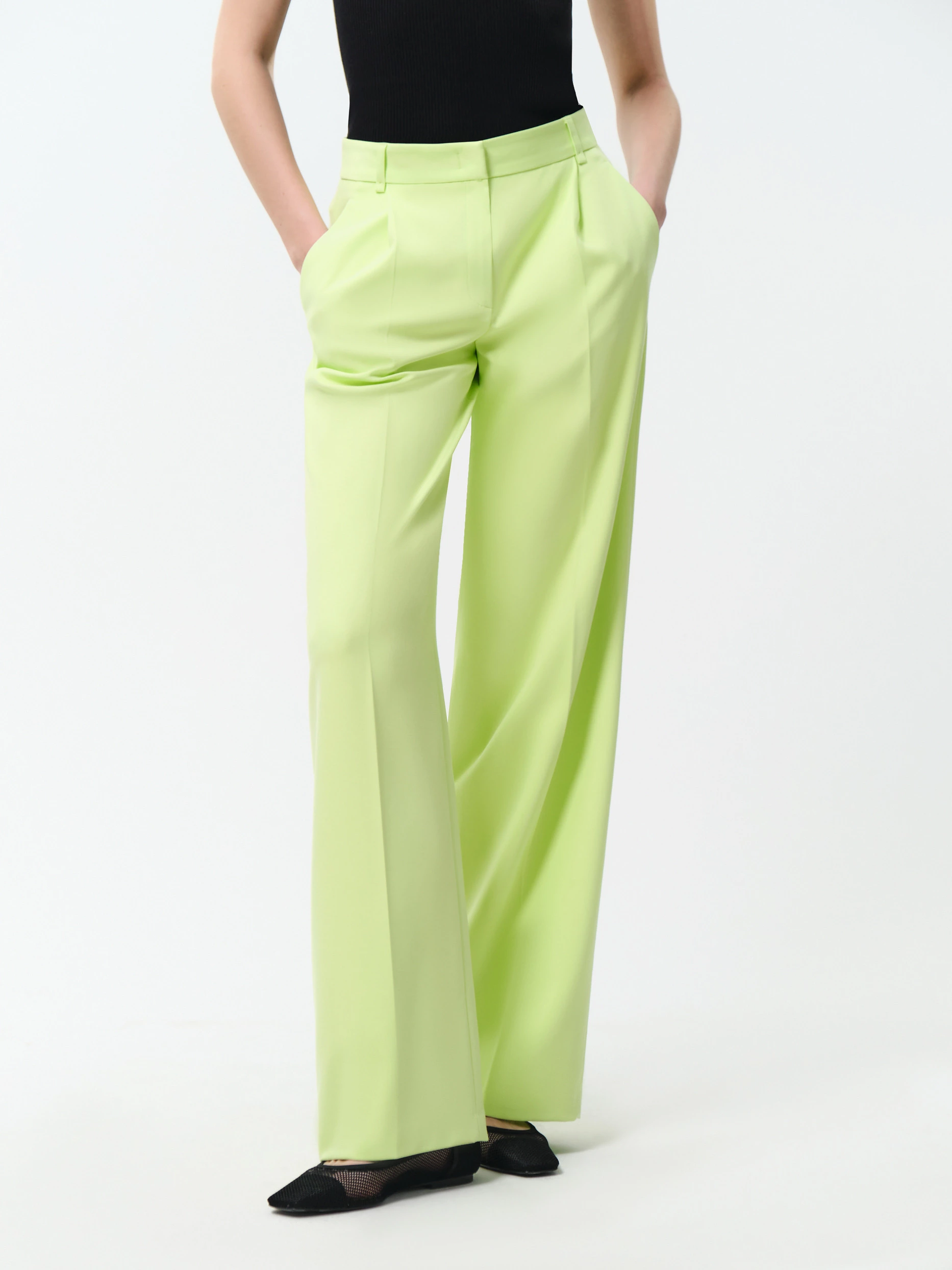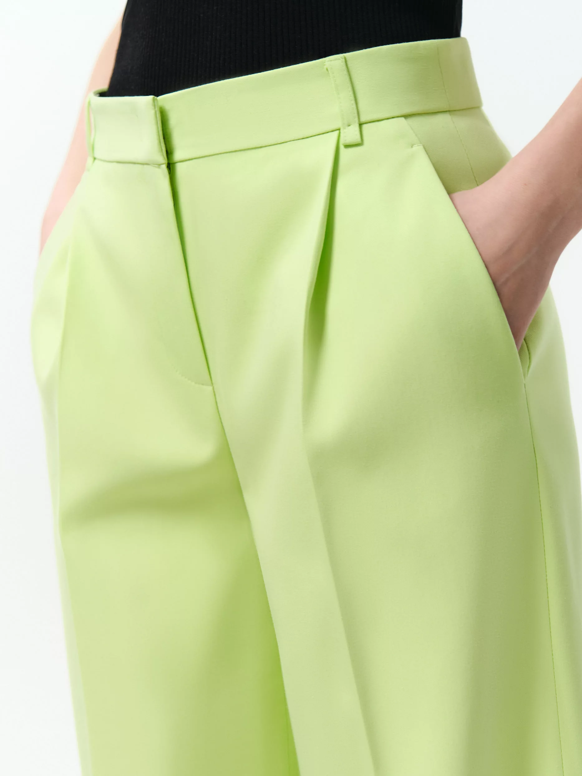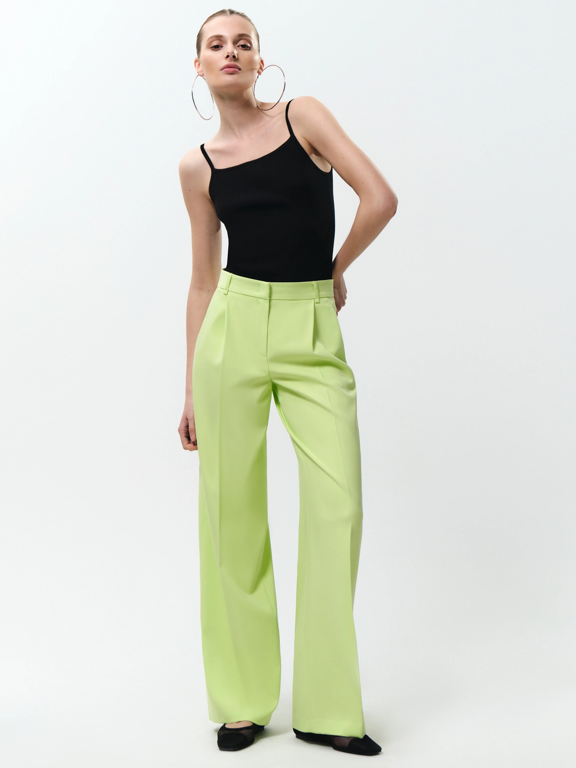 Классические брюки со стрелками с легкостью перенесут из рабочего кабинета на вечеринку или в парк, за счет летней расцветки. Струящаяся ткань и защипы делают эту модель актуальной и для праздничного торжества. Дополните брюки базовым верхом и завершите образ аксессуарами в трендах сезона.