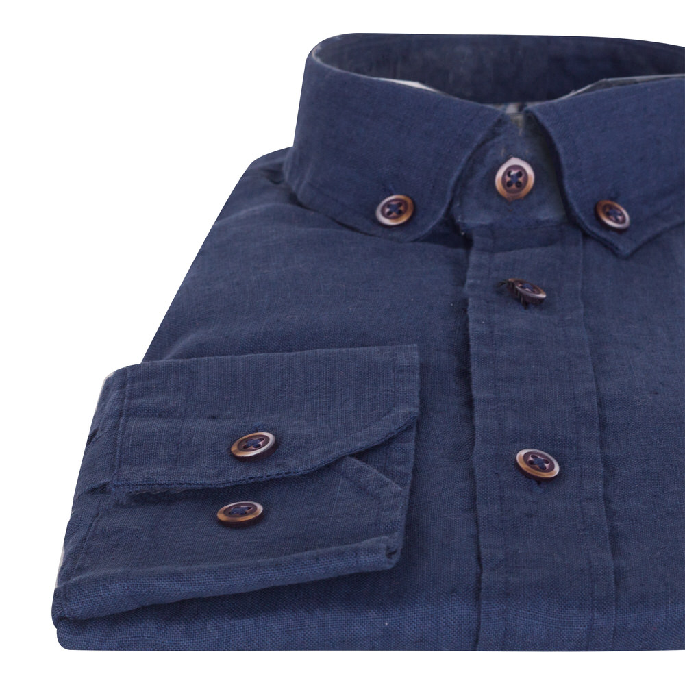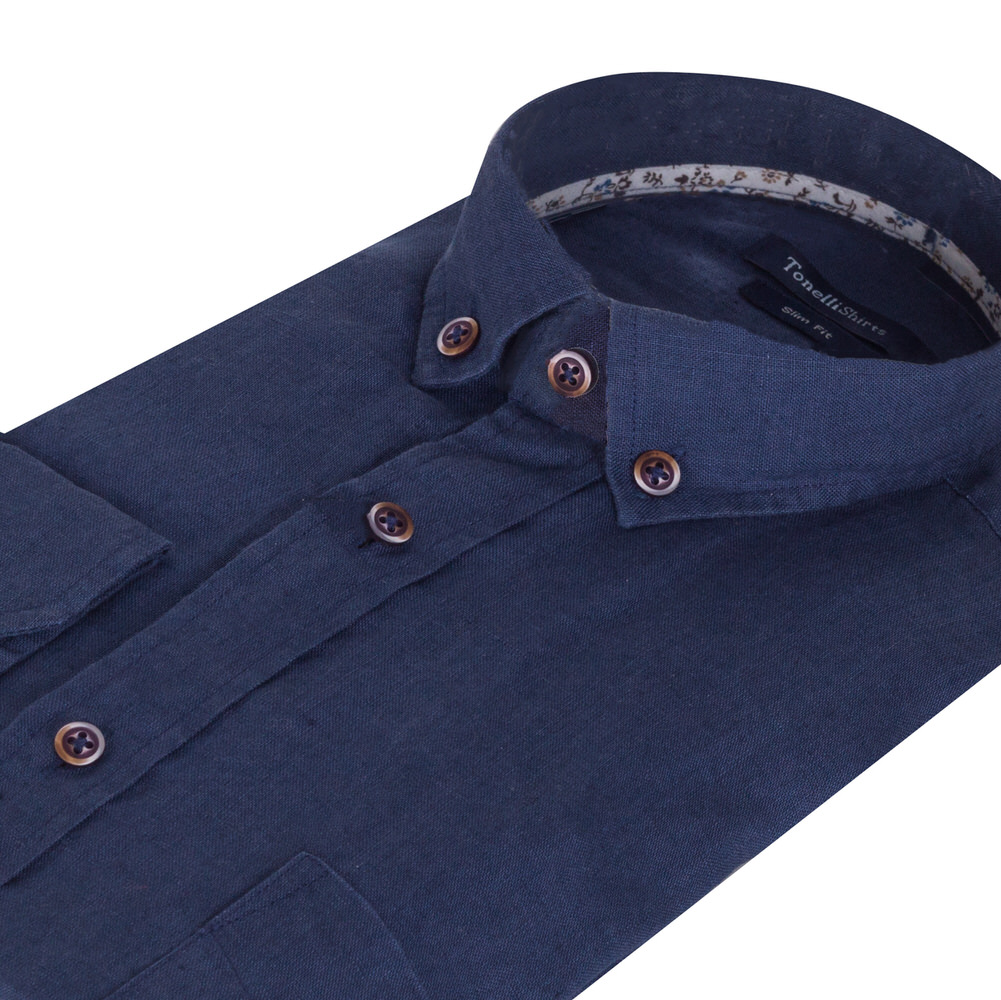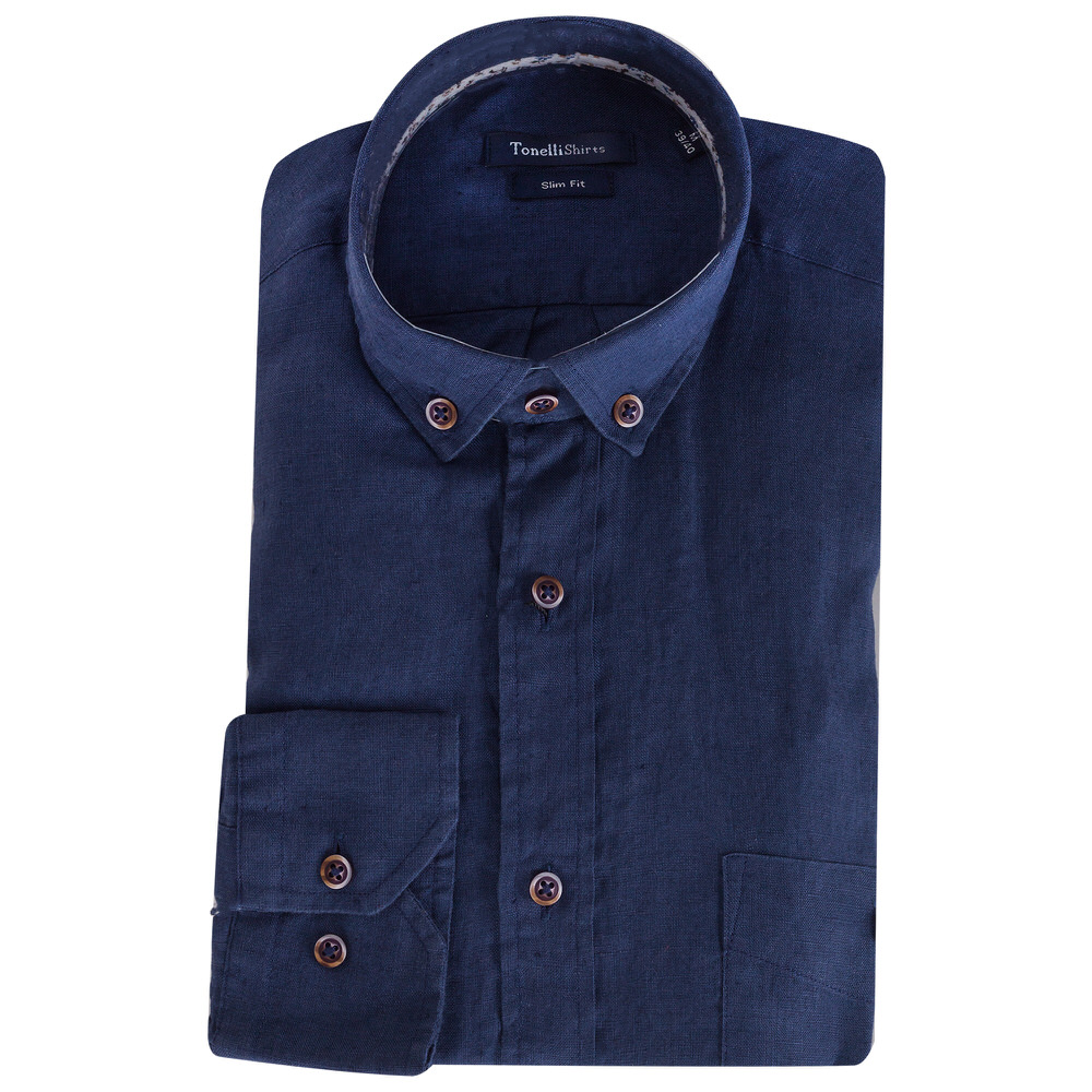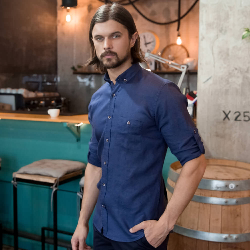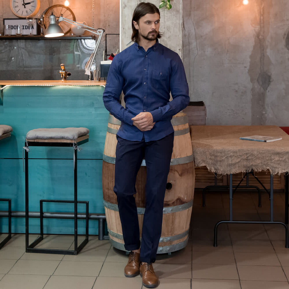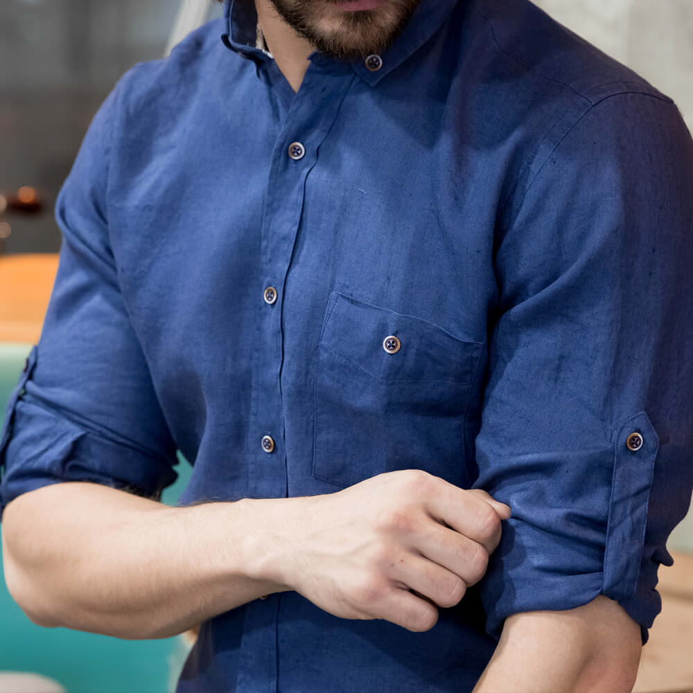 Приталенная мужская рубашка льняная синяя с длинным закатывающимся рукавом