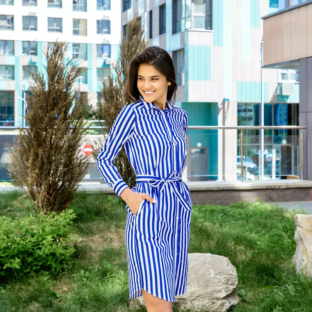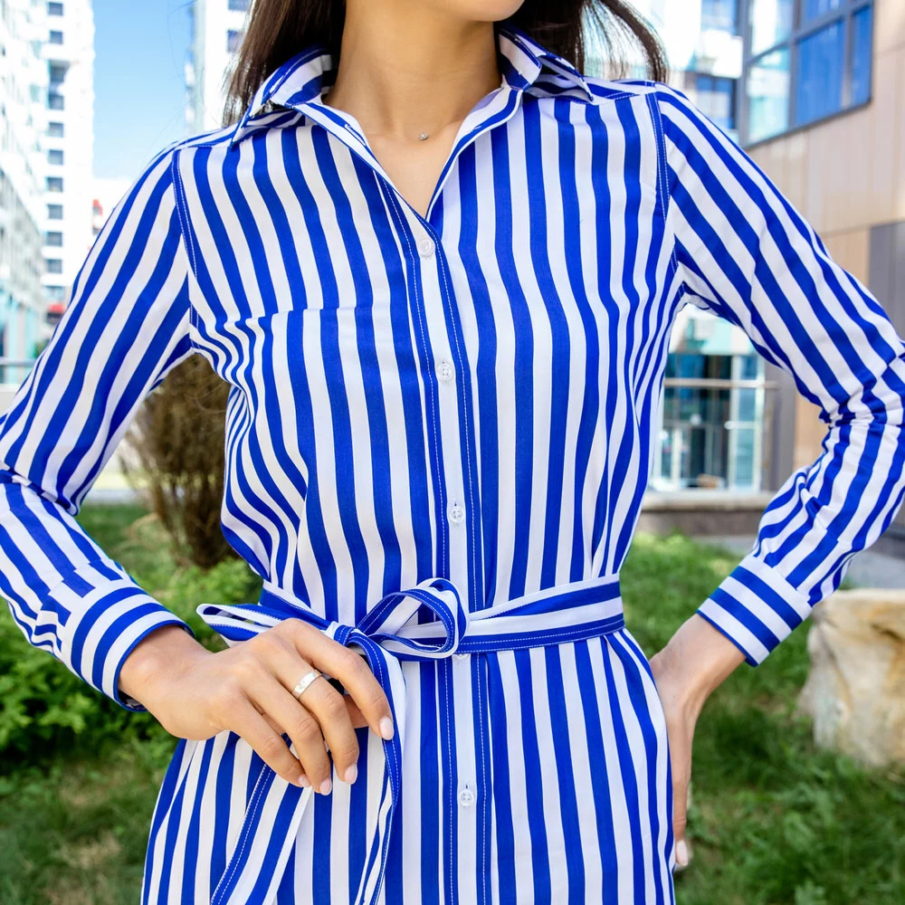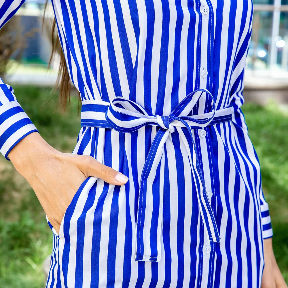 Платье-рубашка под пуговицы в синюю полоску с поясом прямой силуэт.