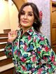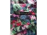 Приталенная женская рубашка с высоким манжетом под пуговицы узор тропические цветы.