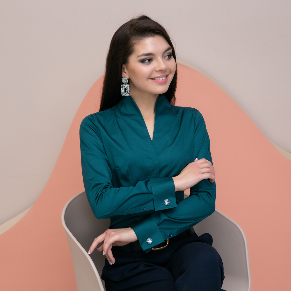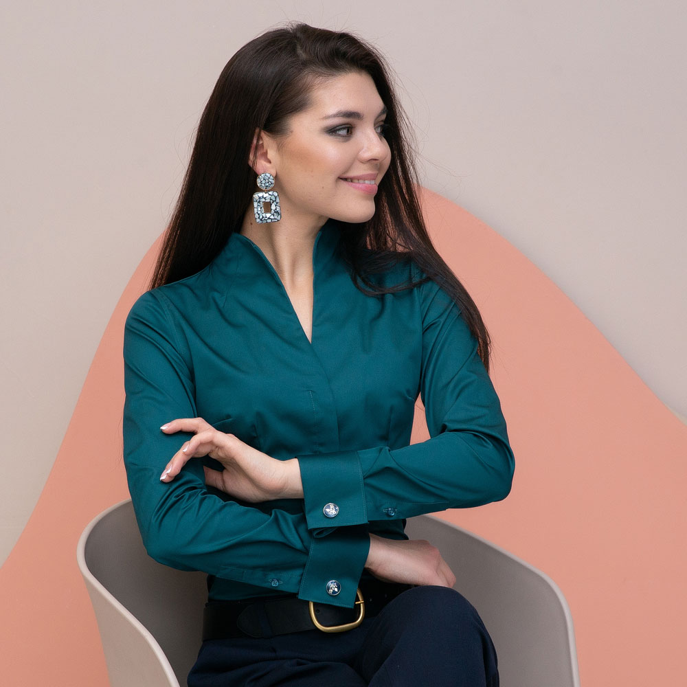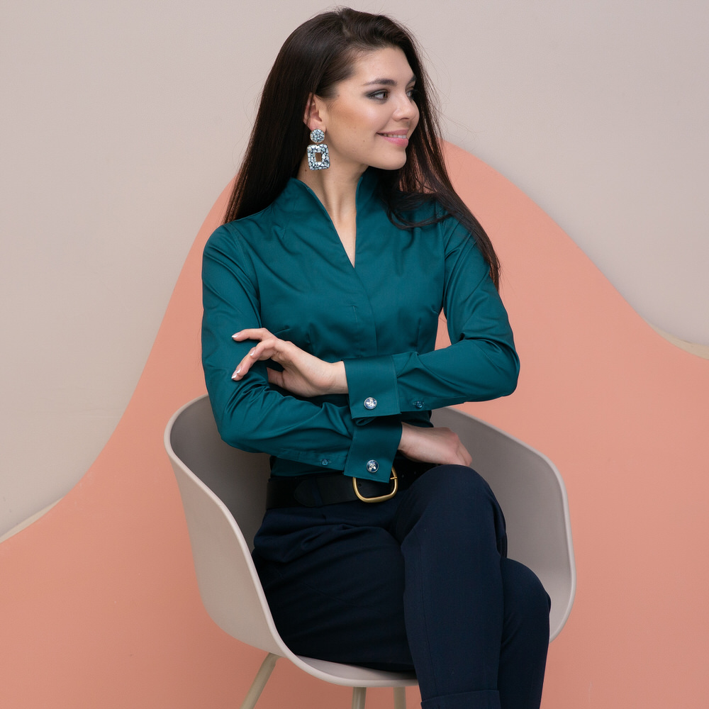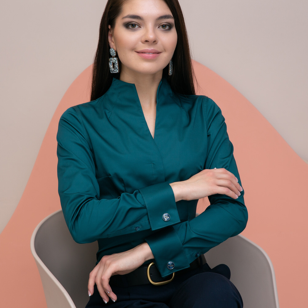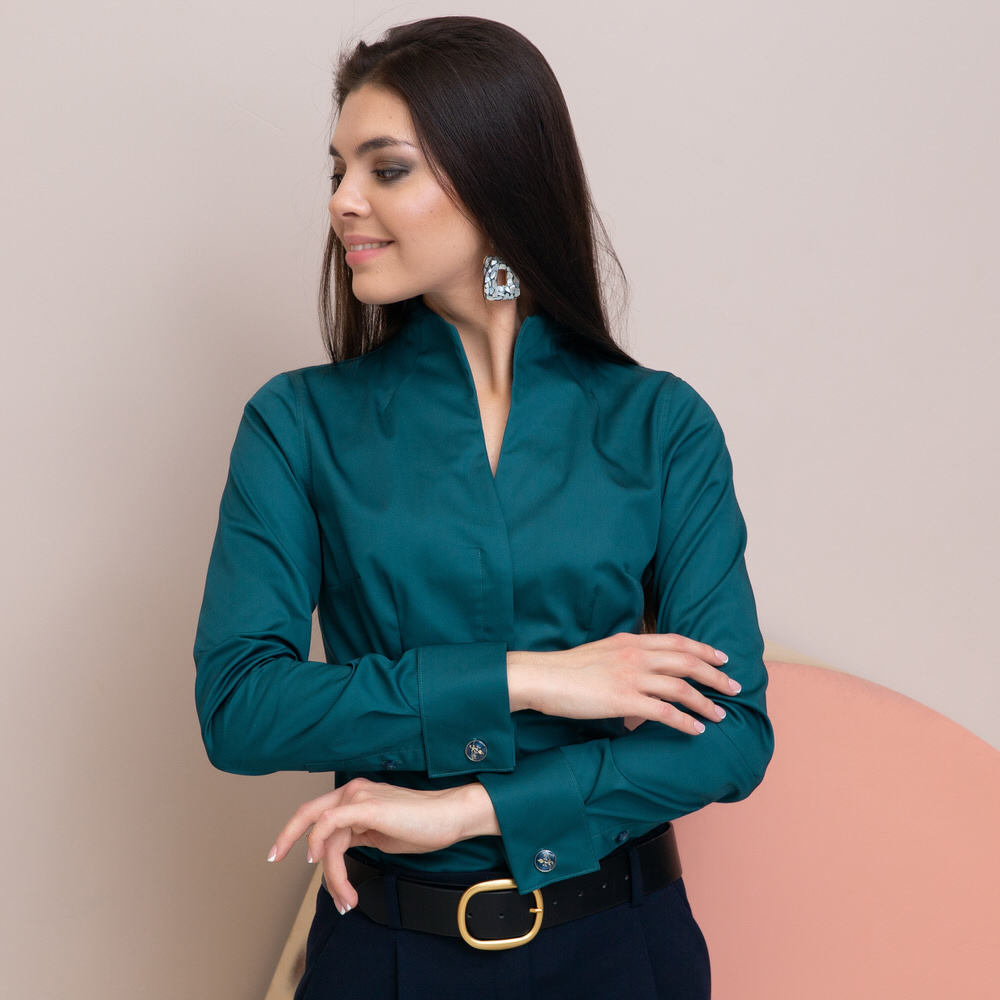 Приталенная женская рубашка с воротником стойка выглядит очень эффектно и необычно.