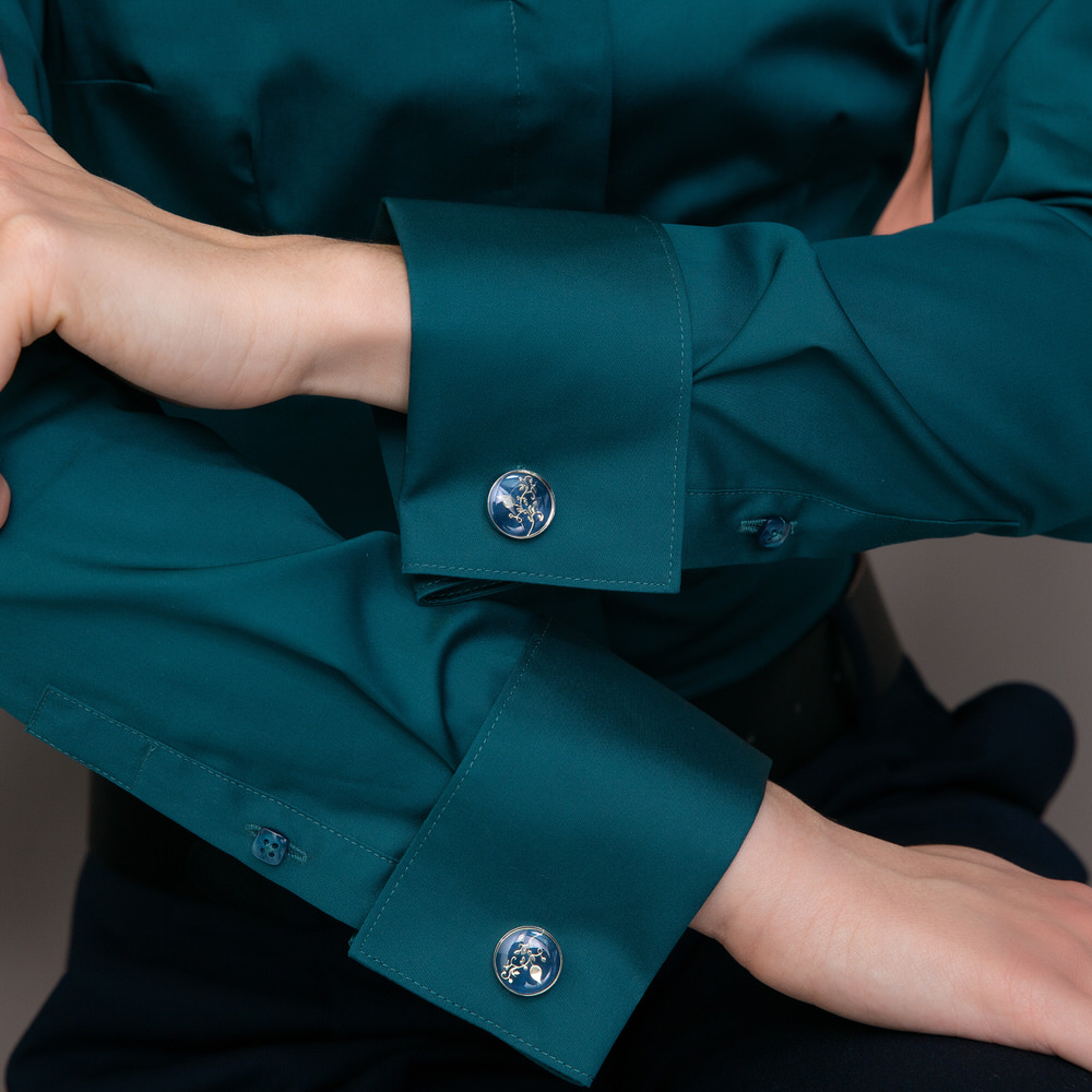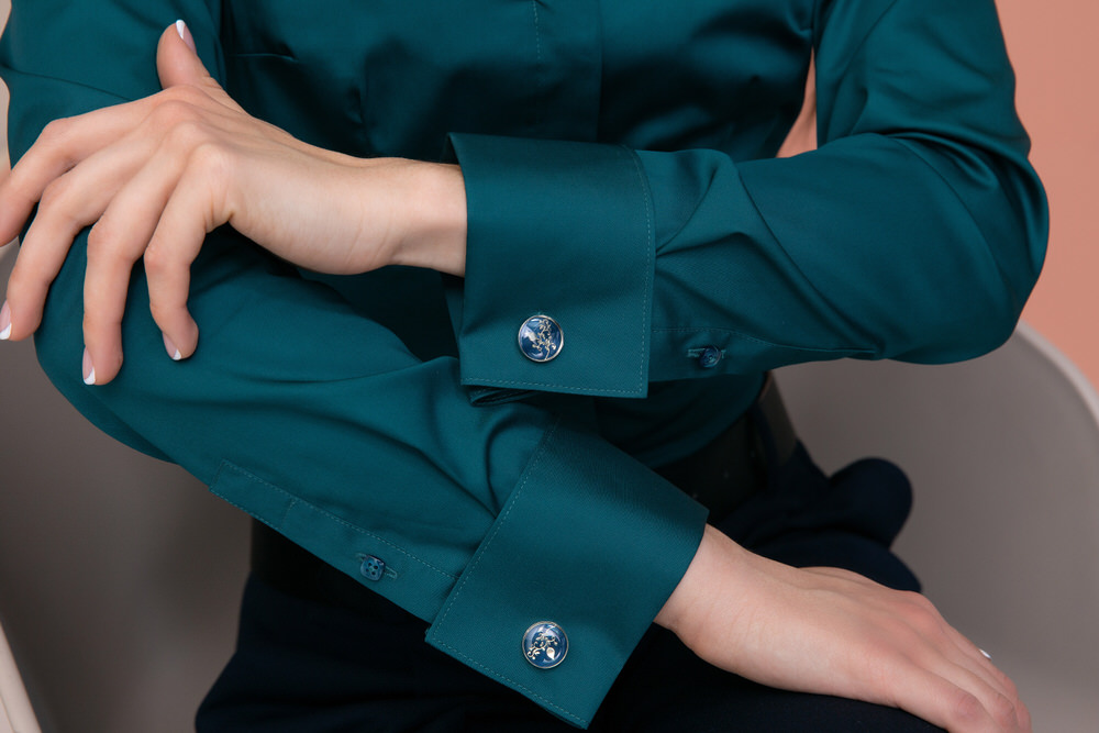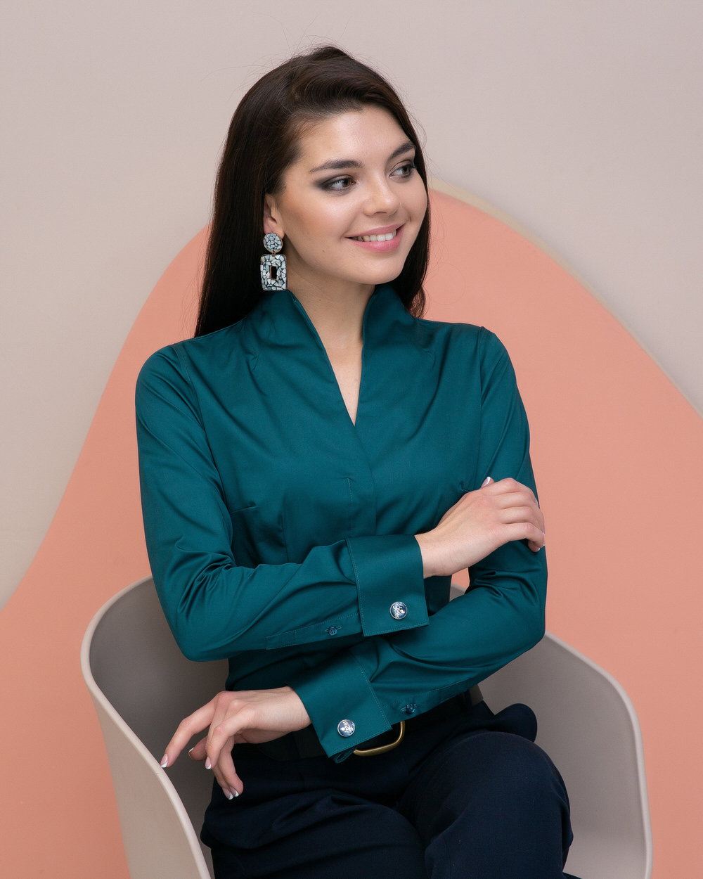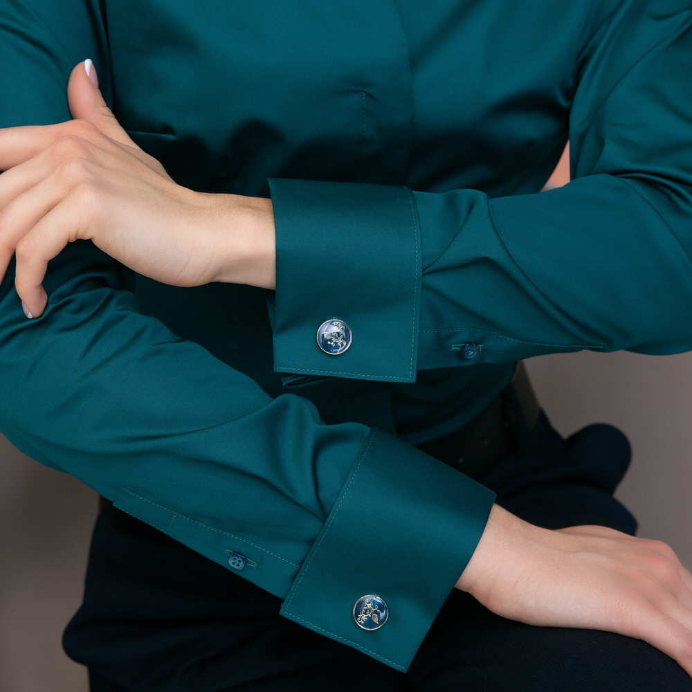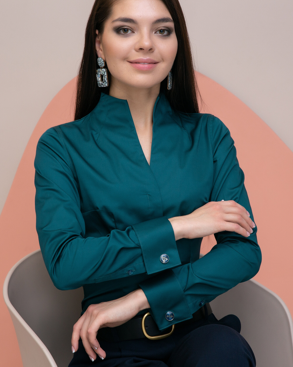 Приталенная женская рубашка с воротником стойка выглядит очень эффектно и необычно.