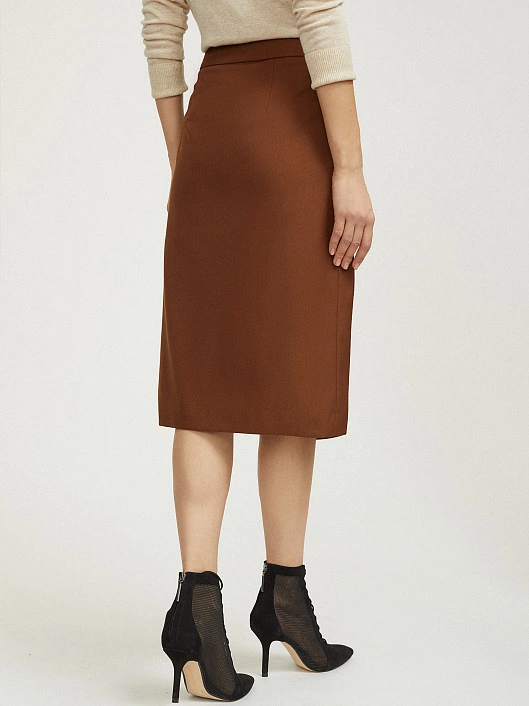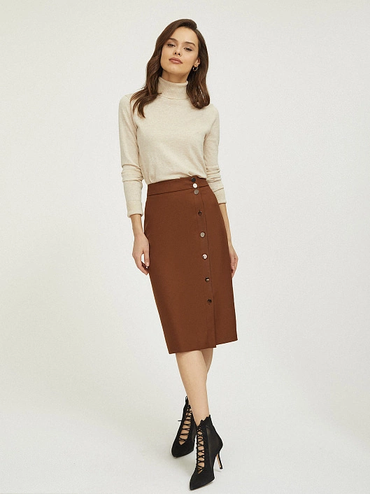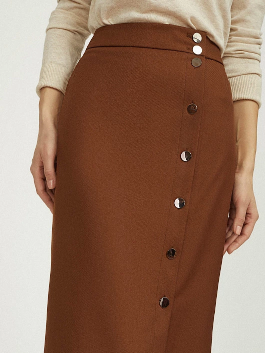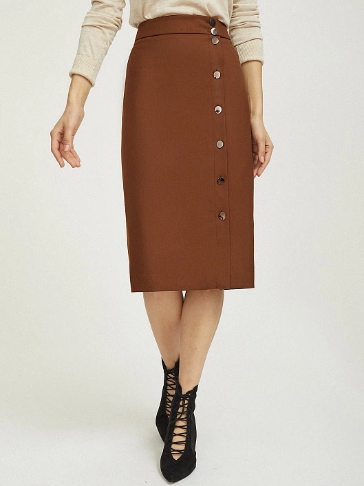 Прямая однотонная юбка. Высокая посадка, втачной пояс, подкладка. Застегивается на асимметричный ряд пуговиц.