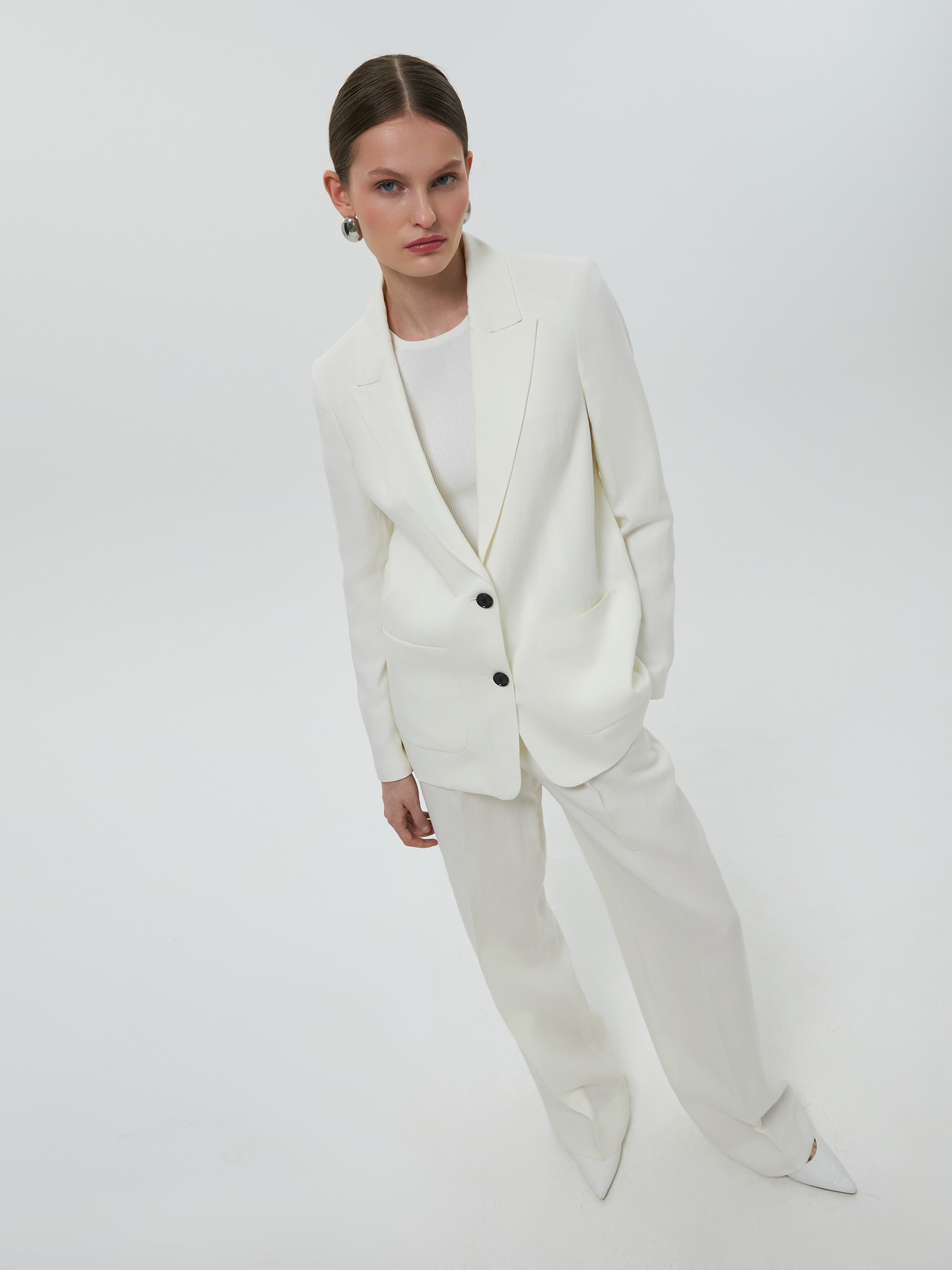 Прямой жакет станет незаменимым игроком в базовом летнем гардеробе. Лаконичная модель с контрастными пуговицами сочетается с вещами разной цветовой гаммы, а классический крой легко подстроится под любой стиль. Модель с заостренными лацканами сшили из плотного тенселя с добавлением льняных волокон.